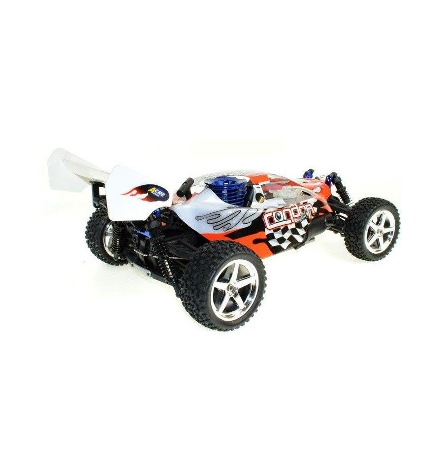 La sencilla caja de cambios, su fácil ajuste de motor y su montaje perfectamente acabado convierten al Buggy Acme Condor RC Nitro escala 1:10 en el mejor aliado para iniciarse en el mundo del radiocontrol a gran velocidad. Dale un poco de combustible (nitrometano) y diviértete quemando gasolina y corriendo en el circuito o en el campo más cercano. Carrocería disponible en varios colores a elegir.