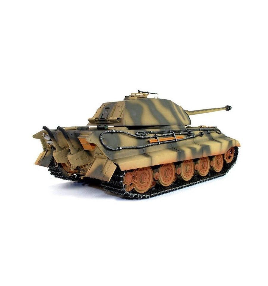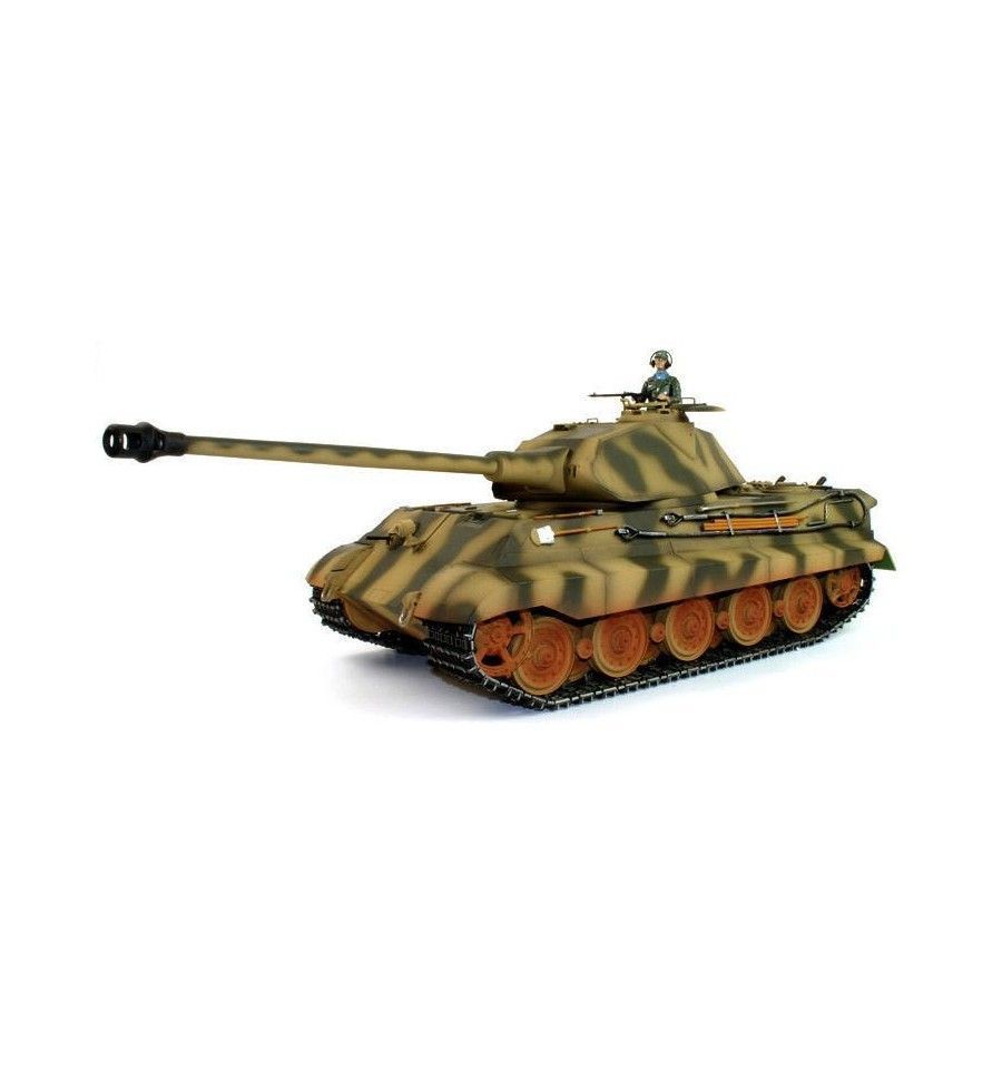 El tanque de radiocontrol Taigen King Tiger escala 1/16 es un modelo de gama alta completamente funcional y con muchas mejoras respecto a los tanques 1/16 estandar. Lo más notable es el cuerpo pintado fantásticamente a mano que hace que tenga un aspecto más realista. Esta es la versión completa y actualizada de metal que viene con todos los accesorios y con kit de transmisor / receptor de 2,4 GHz. El sistema de radio tiene muchas ventajas en comparación con los antiguos sistemas basados en cristal como de rango extendido, sin la interferencia de otros entusiastas y precisión de la dirección. A partir de ahora usted puede tener batallas épicas con el mayor número de tanques de radio control como desee sin la necesidad de cambiar los cristales. La siguiente característica muy interesante es el sonido en esta máquina, el generador de sonido tiene 2 canales y puede jugar 2 sonidos al mismo tiempo – en una palabra se oye la pistola disparando sobre la banda de sonido del motor y junto con el generador de humo y el arma del airsoft BB se suma a la autenticidad respecto al King Tiger real.